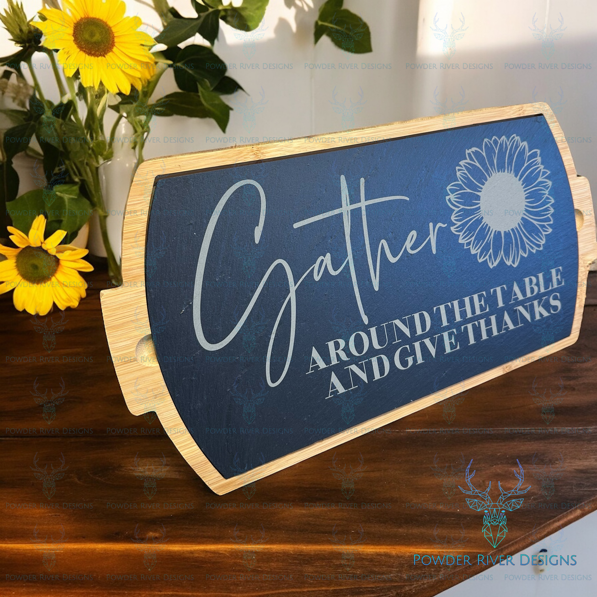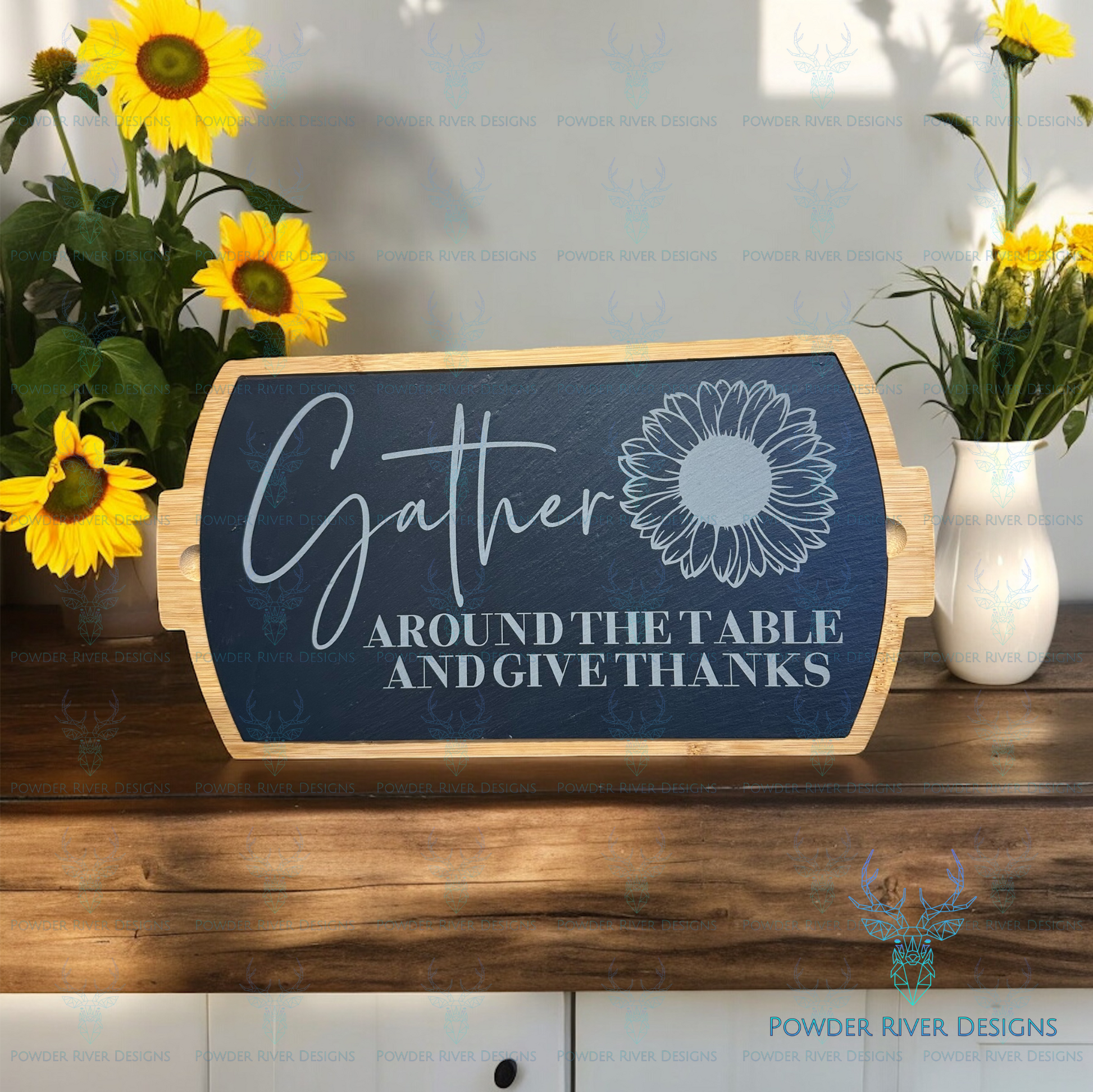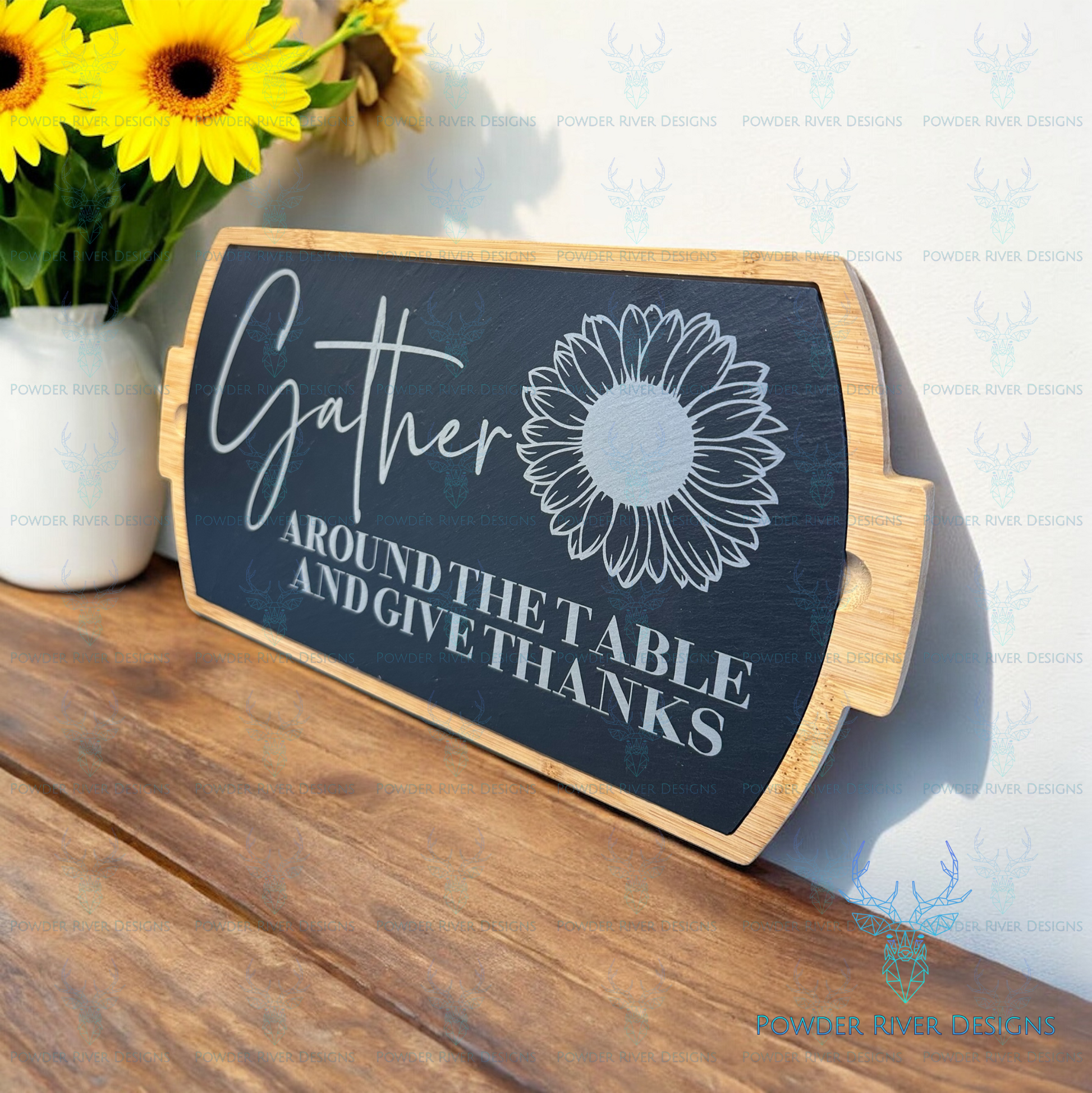 Gather your loved ones around the table with our beautiful Gather Bamboo and Slate Charcuterie Board! Made from bamboo and engraved with a stunning sunflower design, this board doubles as a unique home decor piece and is perfect for serving your favorite meats and cheeses.