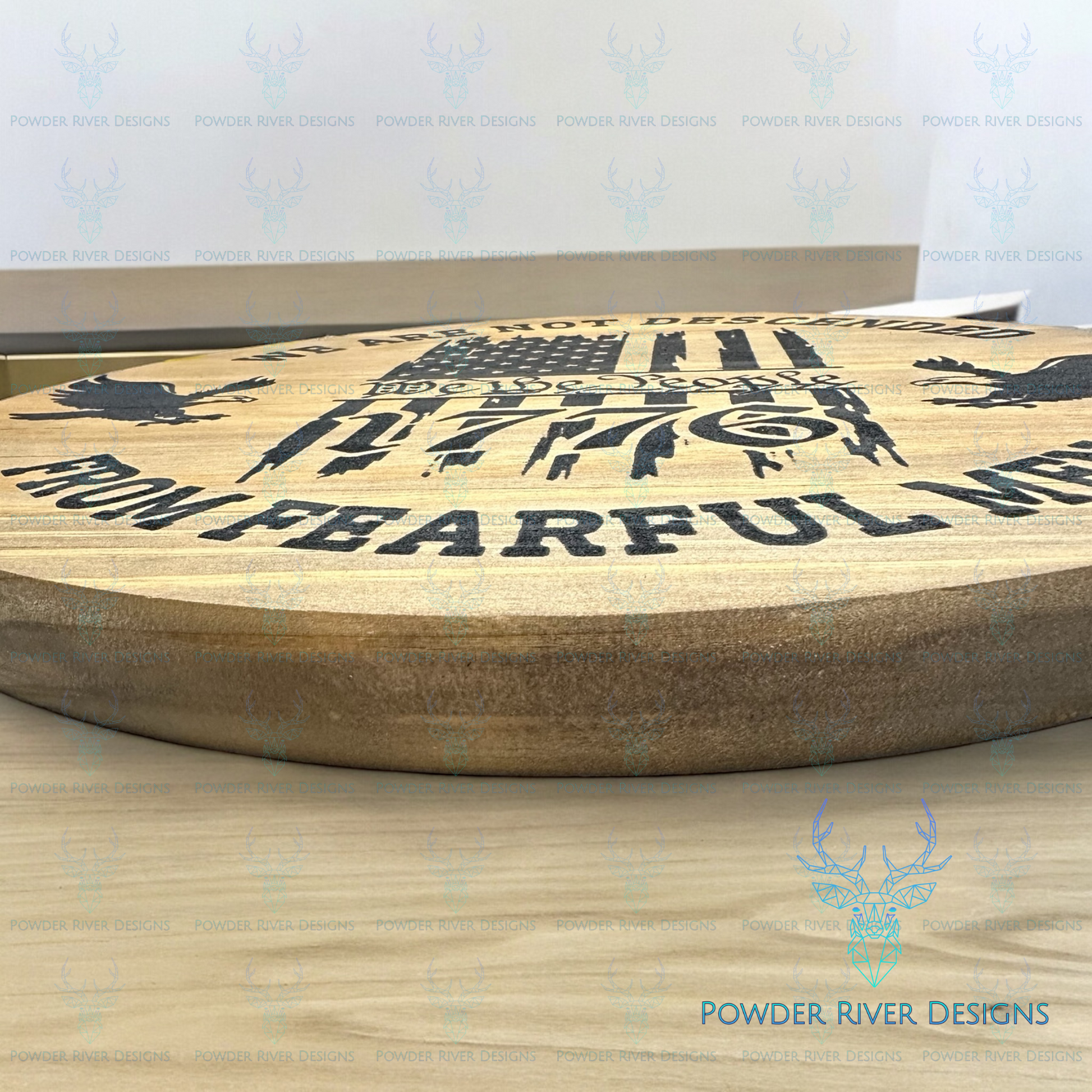 Experience true patriotism with our "Not Descended from Fearful Men" Wood Sign. Made from quality pine wood and expertly laser engraved, this sign proudly displays our country's symbols of strength and courage - eagles and the American flag. Show your passion for our nation with this powerful statement piece.