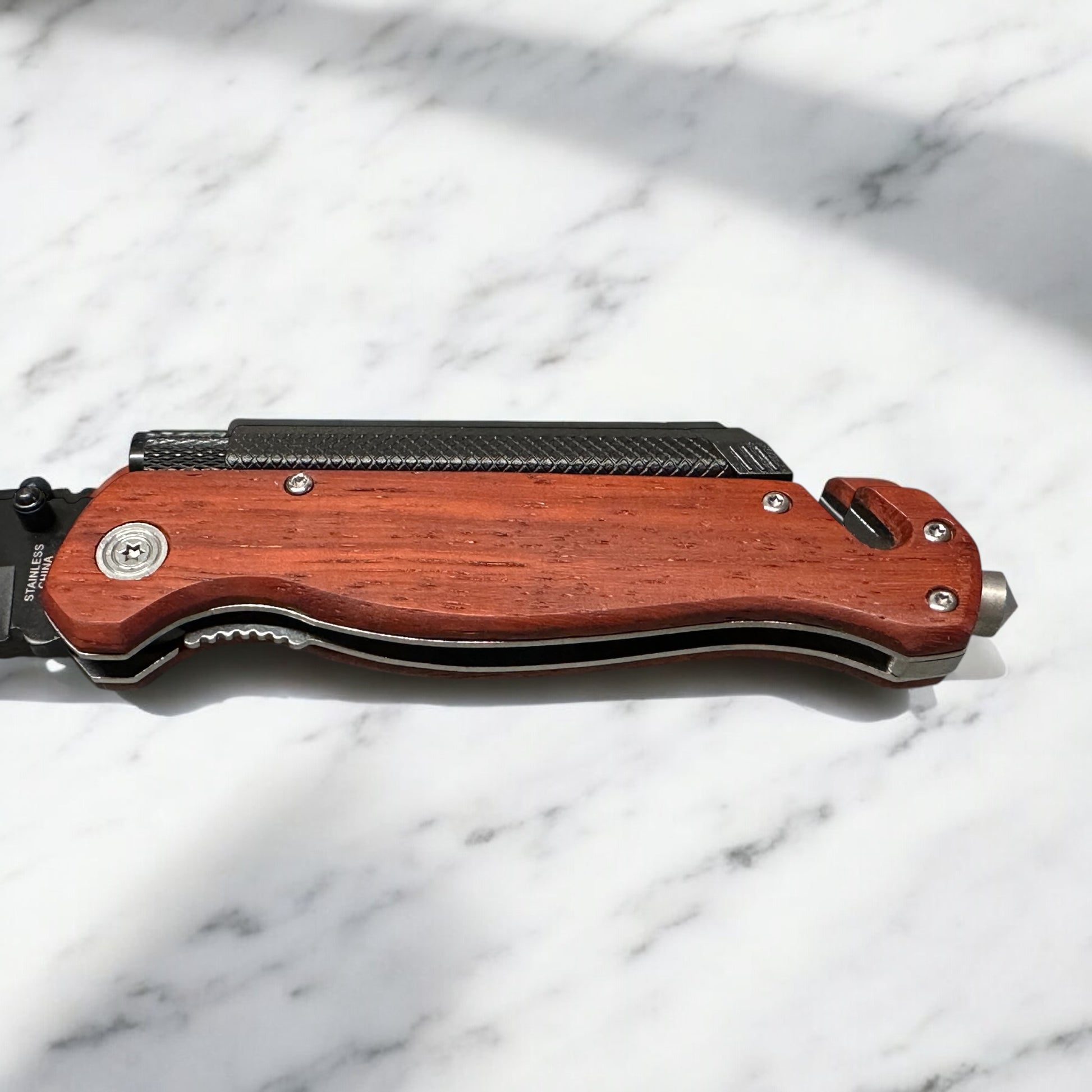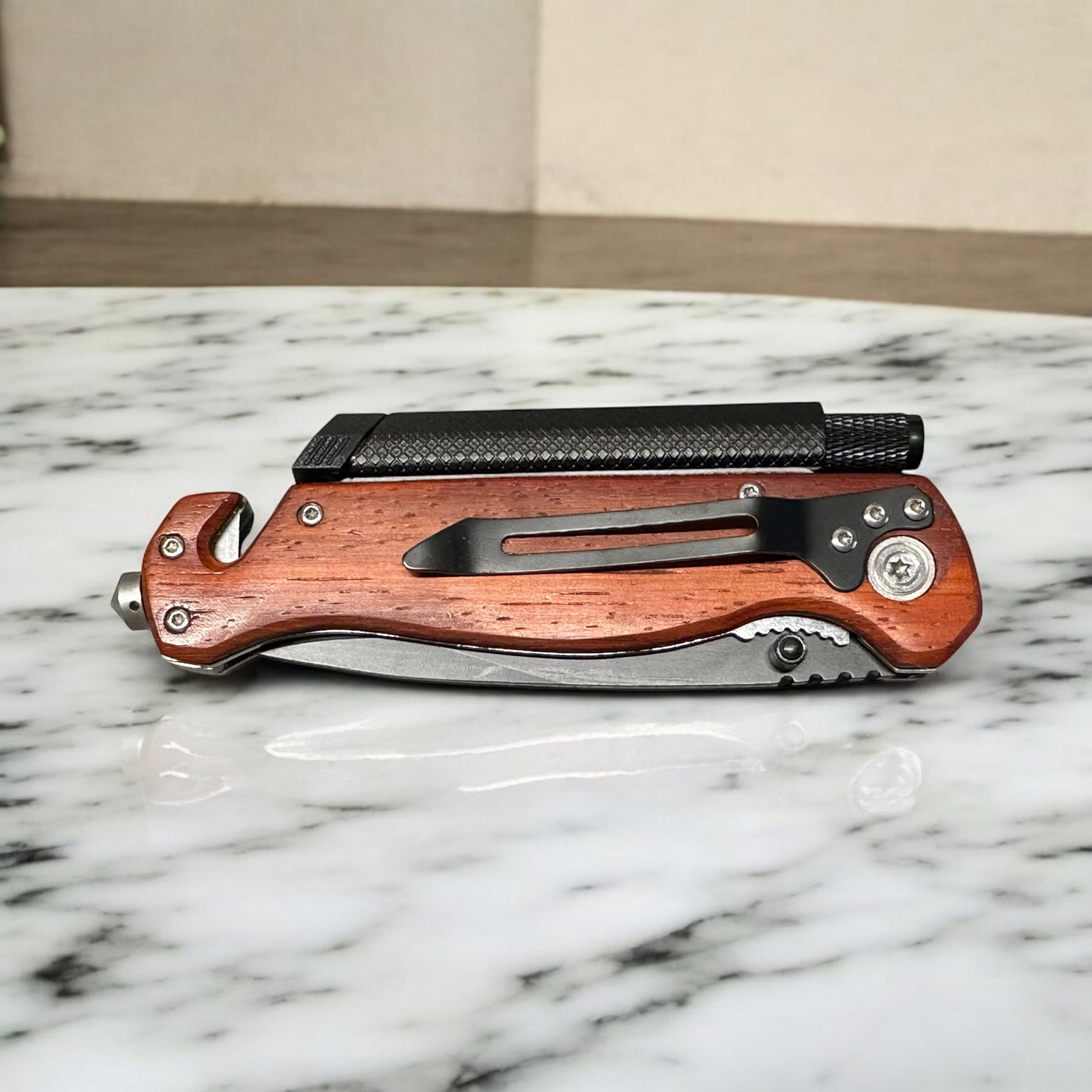 Transform this tactical knife into a unique keepsake with your personalized image engraved! This multi-functional knife includes a flashlight, flint, seatbelt cutter, and glass breaker, making it a perfect gift for anyone. Be prepared for any situation with this customized tactical knife.